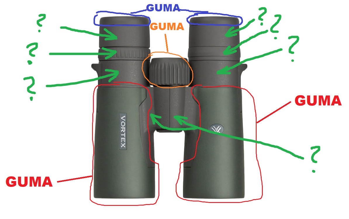 Wracając do problemu gumowych obudów. Obczajam właśnie zdjęcia lornetki Vortex Razor HD. Jest chyba najmniej ogumowana jaka znalazłem z jakością w teorii nawet lepszą niż Viper. Ma też bardzo prostą konstrukcję, na którą można nawet pokusić się o stworzenie jakiego materiałowego pokrowca w formie obszycia tak by całkowicie przykryć gumowe elementy, które najdłużej mają kontakt z rękoma. Czyli w teorii nawet za 20-30 lat jak guma zacznie się potencjalnie rozkładać nie będzie problemu