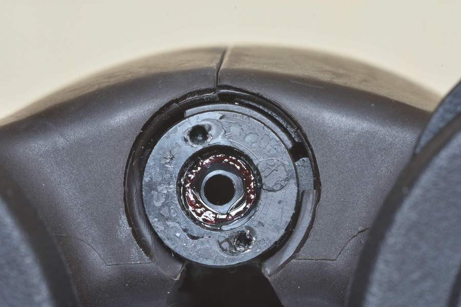 Pod tym kleksem z prawej strony nie ma mocowania śruby blokującej. Tak został przypadkowo w regularny kształt odlany plastik. Sprawia on wrażenie jakby coś pod nim mogło być. Ale niestety nic tam nie ma.